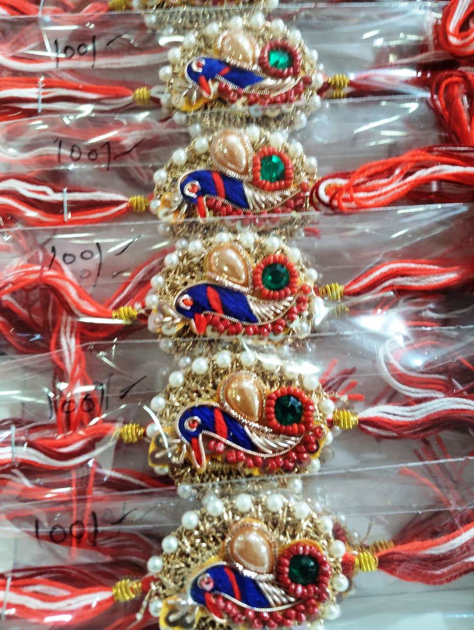 The booti (small floral) embroidery, paired with a bright red thread, adds a festive and elegant touch. Adorned with traditional beads and zari work, this rakhi blends cultural charm with modern aesthetics, making it a perfect choice for your beloved brother.